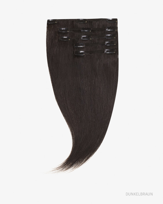 Unsere Sets erhalten Sie in zwei Varianten: ein Set mit 5 Tressen und 13 Clips beinhaltet 3 Tressen mit 3 Clips in einer Breite von ca. 15-18 cm und 2 Tressen mit 2 Clips, die ca. 10 cm breit sind. Das Set mit 7 Tressen und 15 Clips enthält außderdem zwei schmale Tressen, die ungefähr 5 cm breit sind und nur einen Clip besitzen. Eine niedrigere Menge an Tressen und Clips führt dazu, dass ein Set mit 5 Tressen und 13 Clips ungefähr 2g mehr Haare enthält als ein Set mit 7 Tressen. Das bedeutet also, dass das Gewicht der Haare mit ansteigender Menge der Clips abnimmt. Daher fällt das Set mit 13 Clips und einem Gewicht von 100g dichter aus als z. B. eines mit 18 Clips in der gleichen Gewichtsklasse, das von der Konkurrenz angeboten wird. Denn in dem Konkurrenzprodukt wird das Gewicht des Produktes durch die extra Menge an Clips erhöht und nicht etwa durch das Wichtigst, nämlich die Haare selbst, wie man es als Käufer wünschen würde.